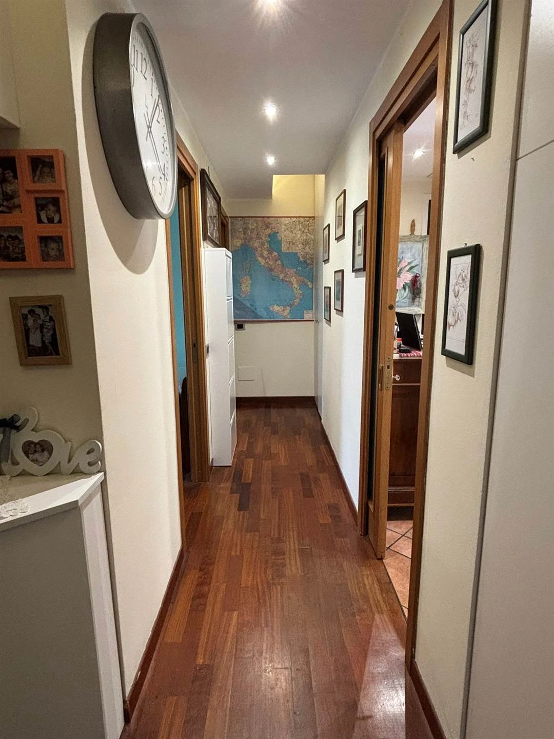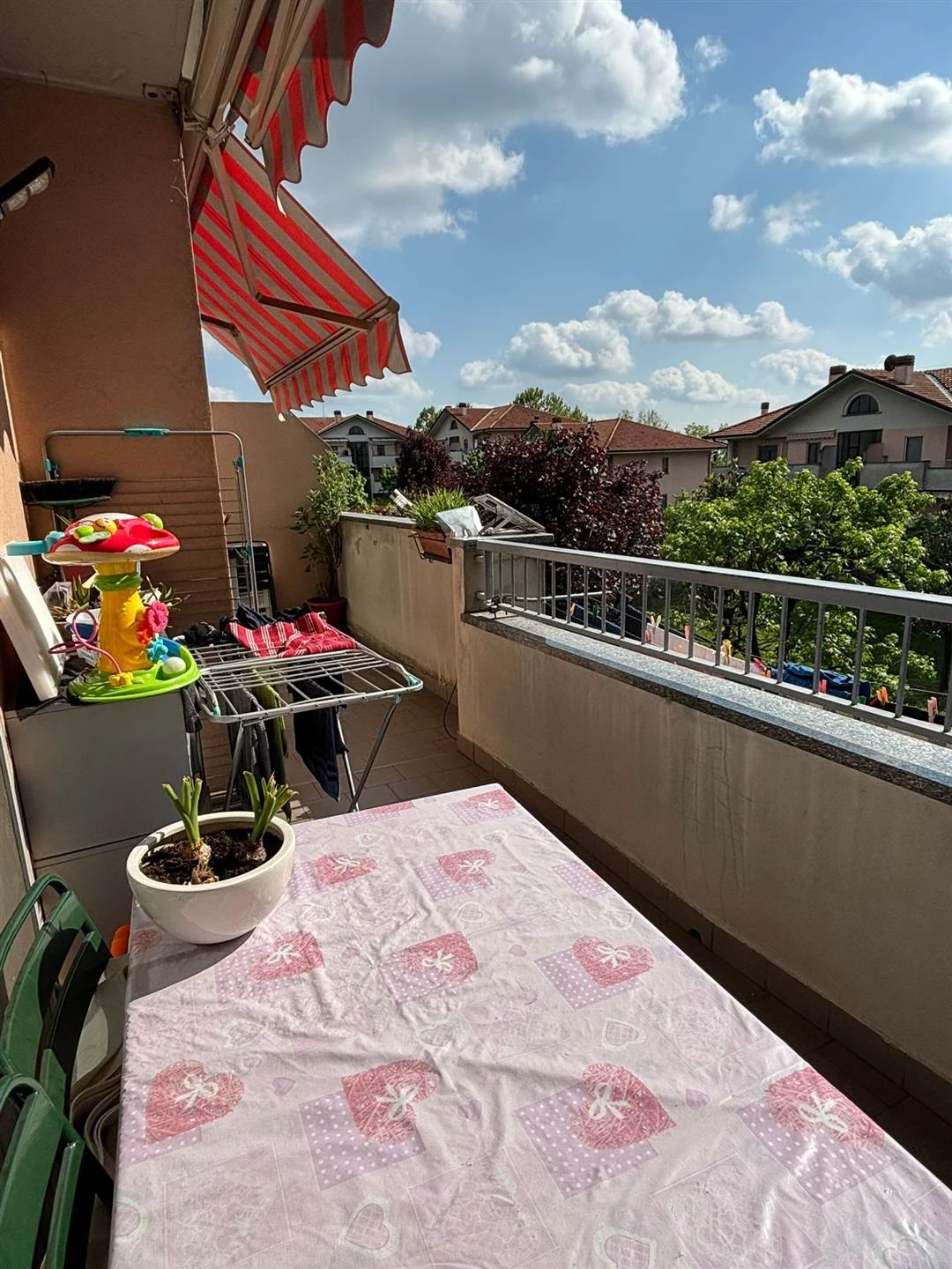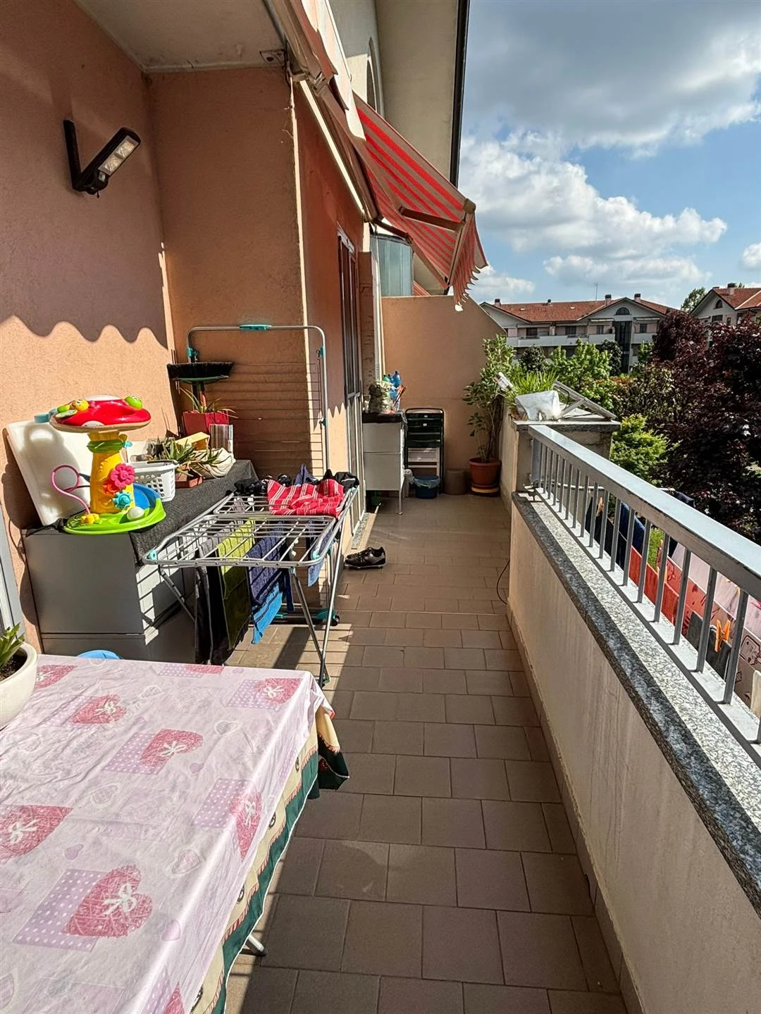 L'ingresso si apre su un accogliente disimpegno che conduce a una cucina abitabile e a un ampio soggiorno, entrambi valorizzati da un terrazzo esposto a ovest, perfetto per godersi la luce naturale e momenti di relax. La zona notte, ben separata, offre tre camere da letto spaziose, due delle quali con accesso al balcone, oltre a due bagni finestrati che garantiscono comfort e praticità.
