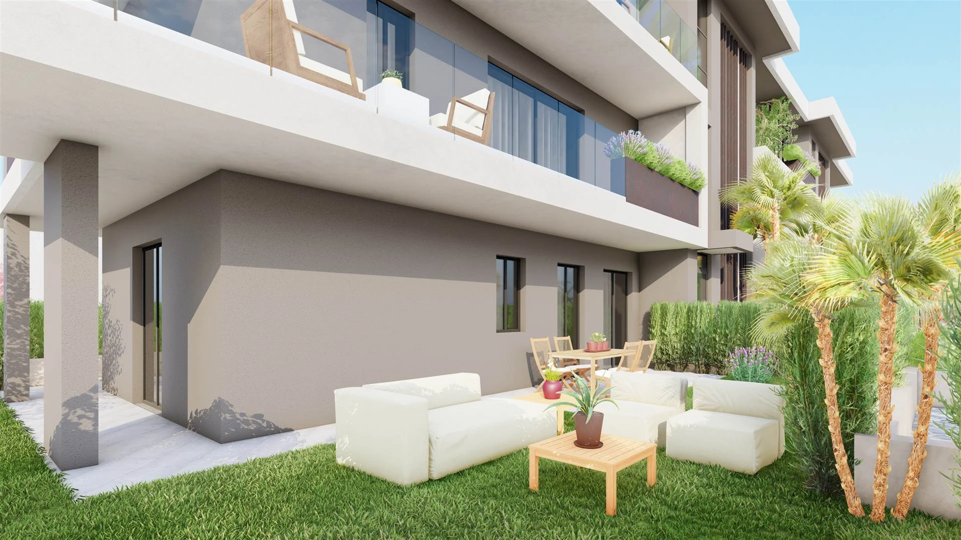 Bilocale posto al piano terra con giardino esclusivo di 118 m2 più area esterna pavimentata di 33 m2. Ingresso nel luminoso soggiorno con bagno finestrato e comodo spazio lavatrice nel corridoio che porta alla camera matrimoniale.