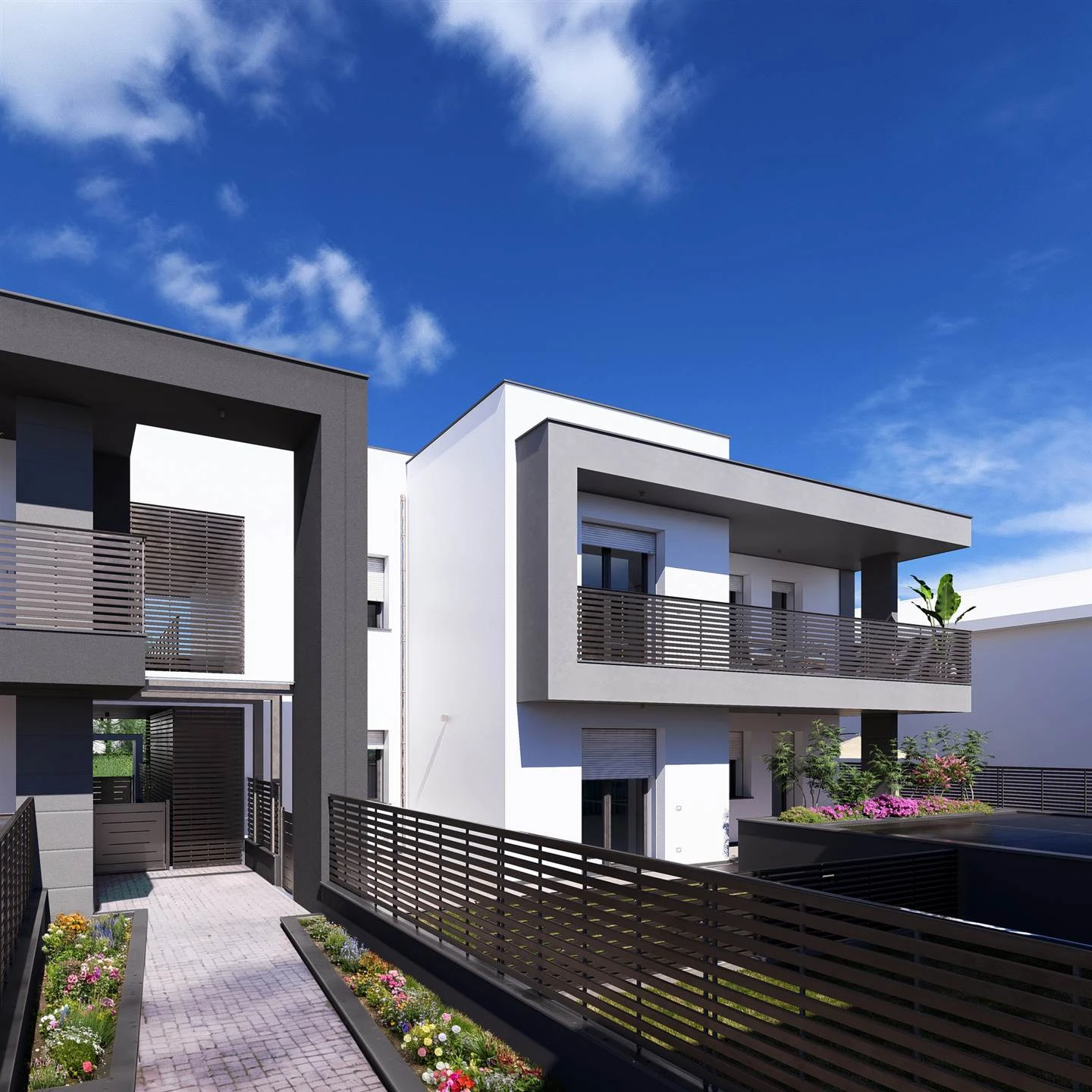 A Verdello, in via L. Einaudi, sta prendendo forma una nuova residenza composta da eleganti ville bifamiliari, ciascuna suddivisa in sole due abitazioni: una al piano terra e una al piano primo ed ultimo.