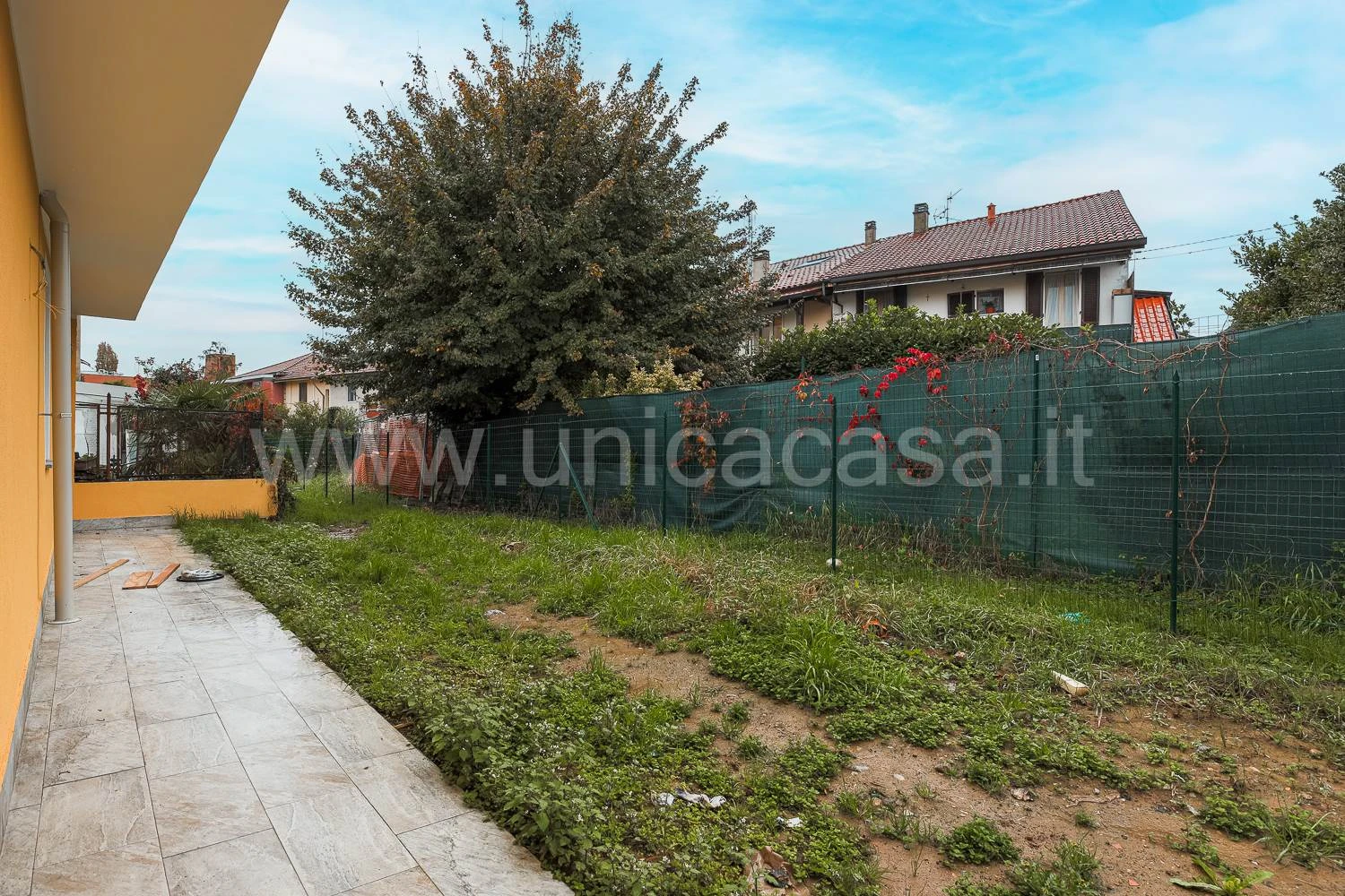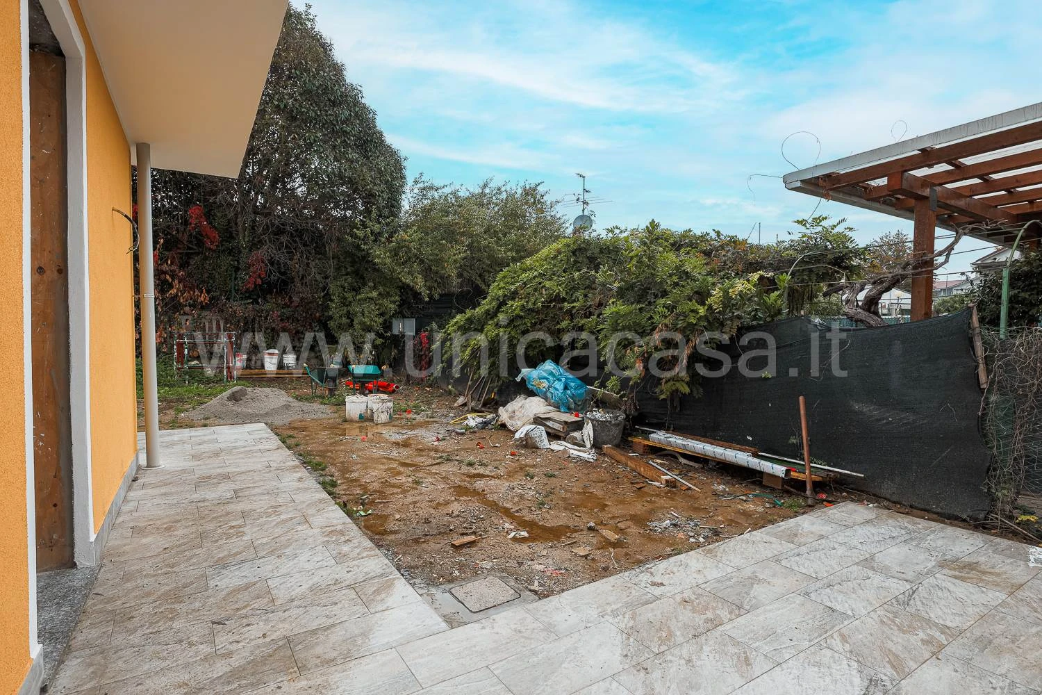 L'ingresso si apre su un ampio soggiorno con angolo cottura affacciato sul giardino privato, in parte pavimentato e predisposto con attacchi per una zona barbecue, ideale per vivere al meglio gli spazi esterni. La zona notte comprende una camera matrimoniale, un bagno principale e due generose camerette, di cui una con bagno privato.