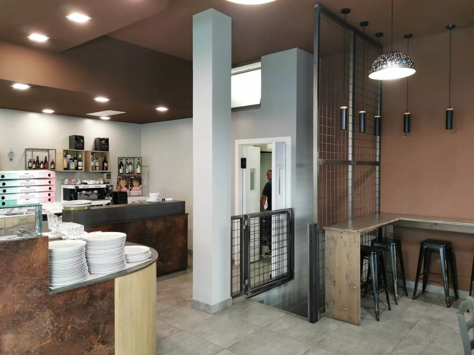 Al piano terra, su una superficie di circa 120 mq, si sviluppa la sala ristorante con 40 posti a sedere, un'ampia zona pizzeria con forno a legna capace di cuocere fino a 12 pizze contemporaneamente, una cucina completamente attrezzata e doppi servizi per la clientela.